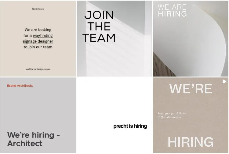 In questo screenshot qui di seguito puoi notare qualche vecchio post di studi di architettura italiani e internazionali che sfruttano la loro influenza su Instagram per innescare il passaparola sulle loro offerte di lavoro. Sicuramente un modo divertente e senza eccessivo stress per tenersi aggiornati.