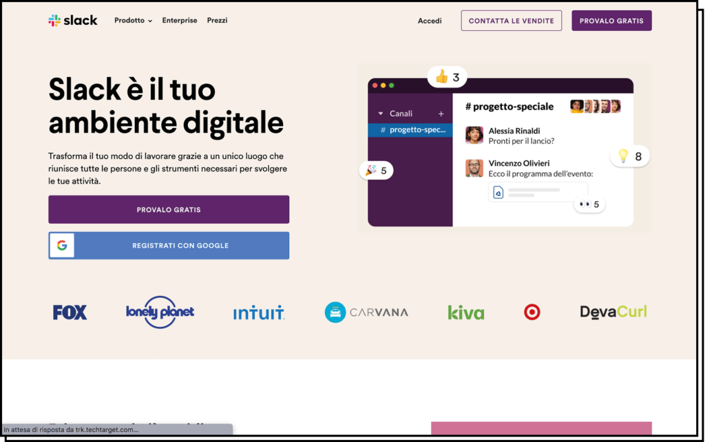 Slack è in assoluto il mio preferito se si parla di chat. È un sistema di messaggistica in cui puoi segmentare per argomento le varie conversazioni e invitare i tuoi colleghi anche singolarmente e privatamente. In questo modo avrai conversazioni ordinate e ritroverai sempre quello che cerchi. È uno strumento del tutto gratuito disponibile tramite applicazione web o scaricando il programma (o tramite l’APP). È intuitivo, affidabile, flessibile e bello da usare. Non gli manca niente e inoltre permette integrazioni con moltissimi altri tool online (tra cui Asana e Trello).