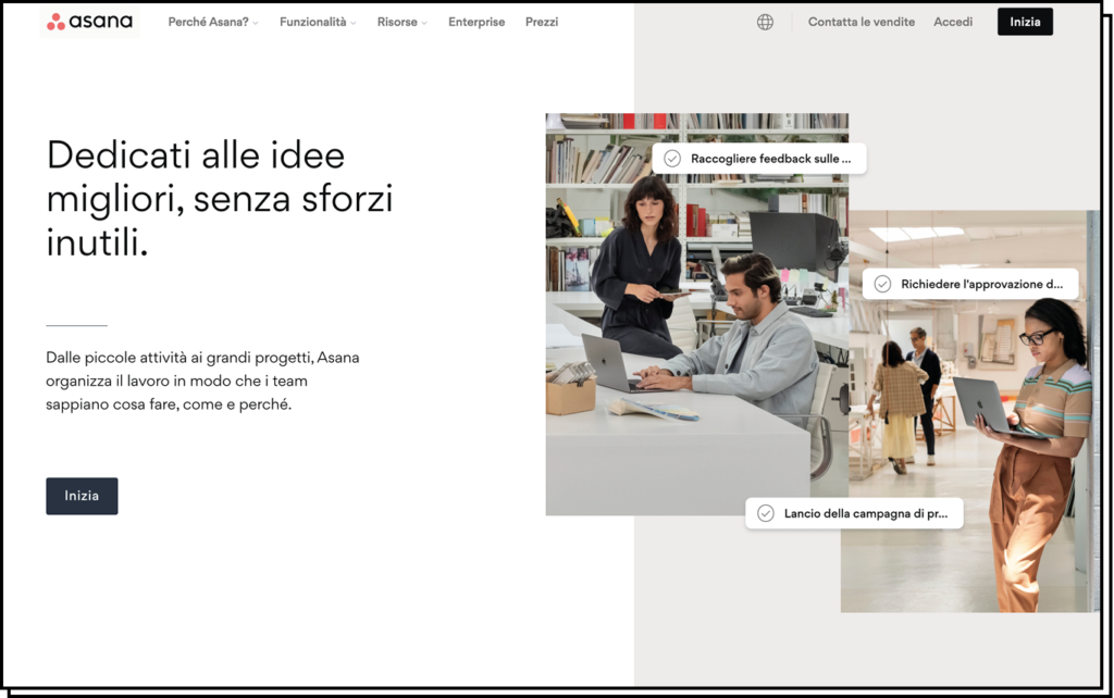 Asana è insieme a Trello (nel prossimo punto) uno dei migliori tool in assoluto per gestire i compiti all’interno del team e per definire un programma di lavoro. Qui potrai assegnare schede, discutere sui compiti, allegare file e fare qualsiasi cosa ti sarà utile per il tuo lavoro e per collaborare in team. Non è una chat (per quello ti consiglio Slack) ma serve per gestire i compiti e completare gli obiettivi di lavoro nei tempi stabiliti. Disponibile anche in App.
